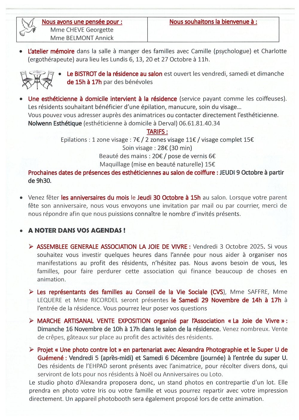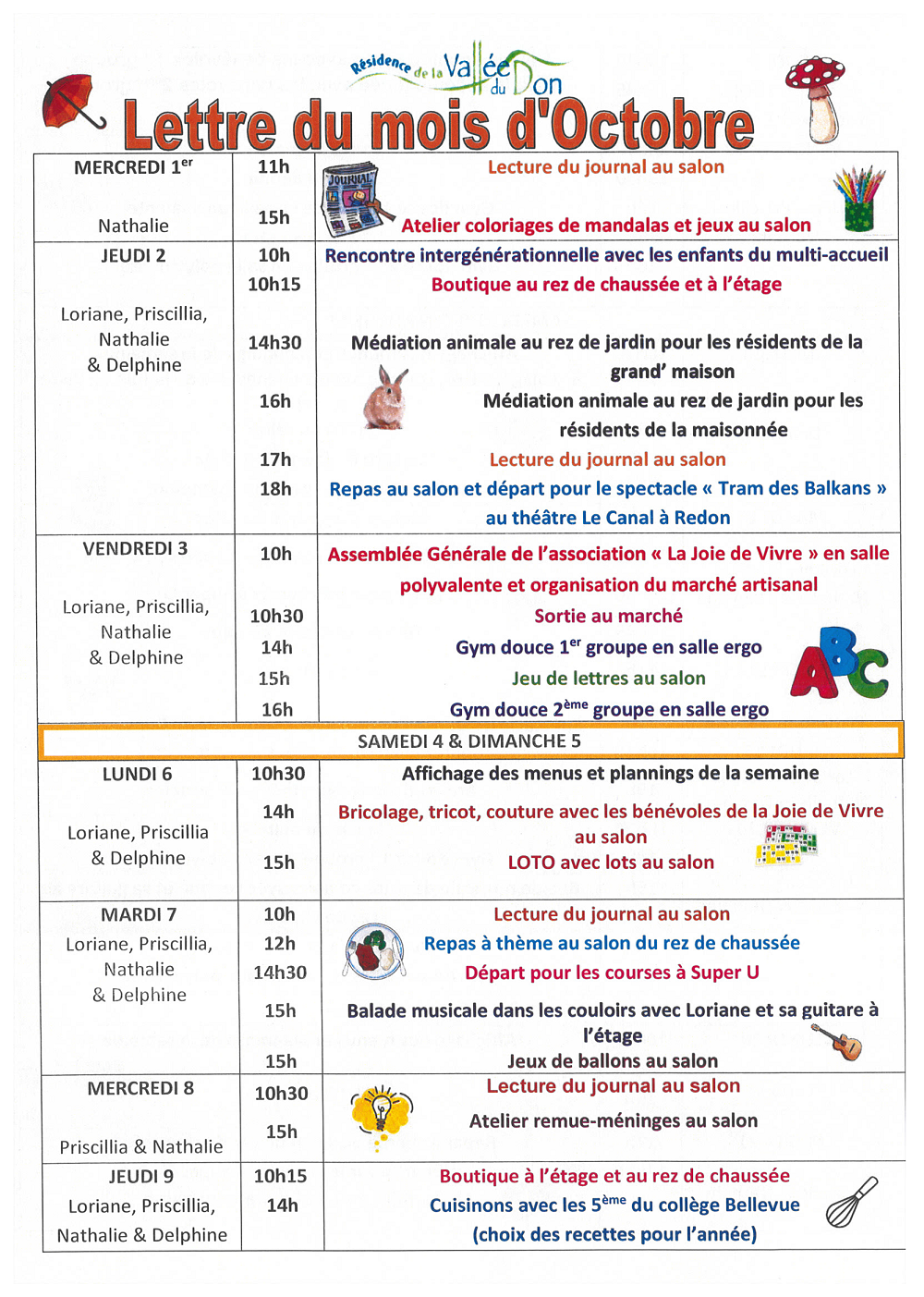 Le programme d'animation Veuillez trouver ci-dessous le programme d'animation du mois d'octobre 2025 favorisant le bien-être physique des Résidents.